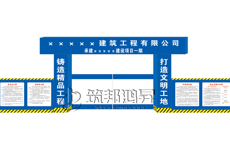 施工現(xiàn)場出入口必須設置工地大門,大門上端設門頭,門頭設置企業(yè)標志,整體形象符合施工企業(yè)CI要求,整潔大方。