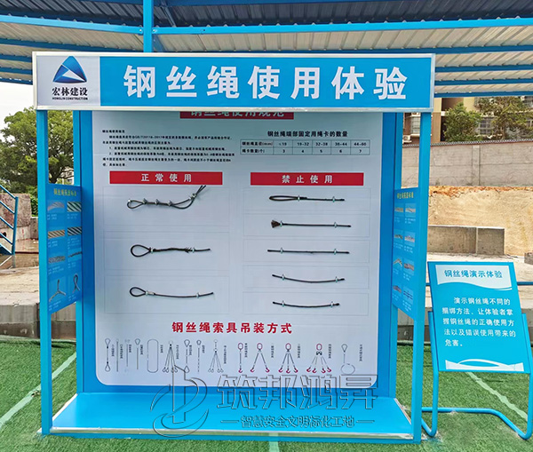 此次合作的工地安全體驗館建設(shè)包括了鋼絲繩使用體驗、綜合用電演示體驗、滅火器演示體驗、平衡木體驗、安全防護(hù)用品展示體驗、安全帽撞擊體驗等。