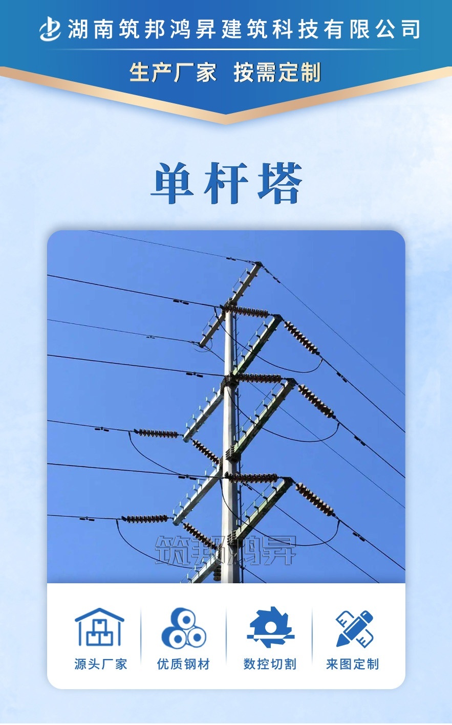 [筑邦鴻昇]單管塔鐵塔采用高壓沖壓、熱鍍鋅工藝,實(shí)力大廠供貨準(zhǔn)時(shí),服務(wù)周到。