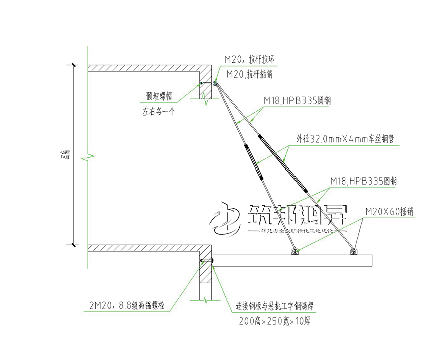 【筑邦鴻昇】新型拉桿式工字鋼懸挑架,通過高強(qiáng)螺栓與結(jié)構(gòu)框架梁錨固,并在前端設(shè)置可調(diào)拉桿與上一層建筑結(jié)構(gòu)連結(jié),形成可承擔(dān)荷載的一次超靜定結(jié)構(gòu)體系。